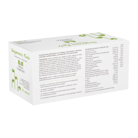 Regenera Forte es un complemento alimenticio a base de péptidos de colágeno, glucosamina, vitaminas, minerales, bioflavonoides y aminoácidos.