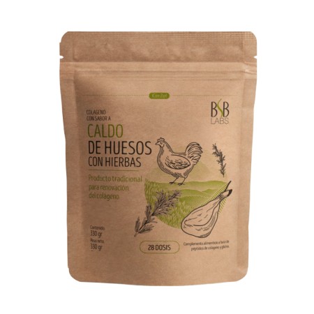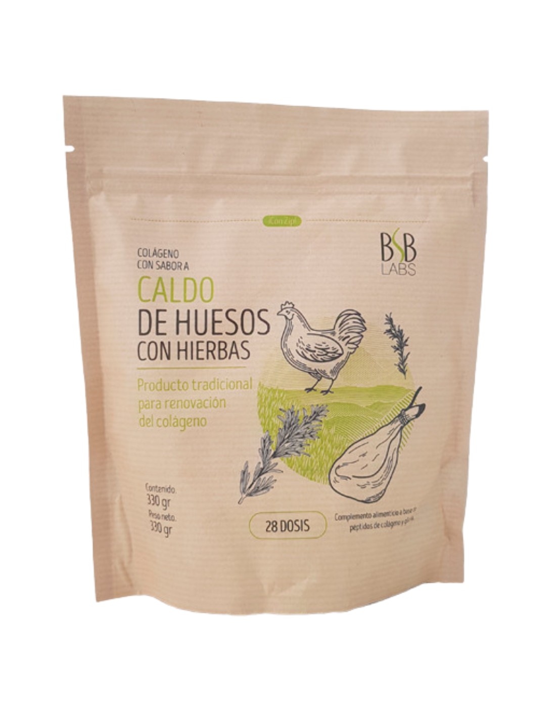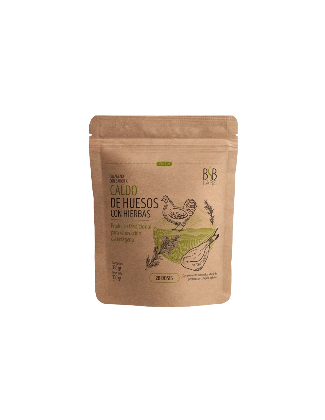 Caldo de Huesos con Hierbas. Complemento alimenticio a base de péptidos de colágeno y glicina.