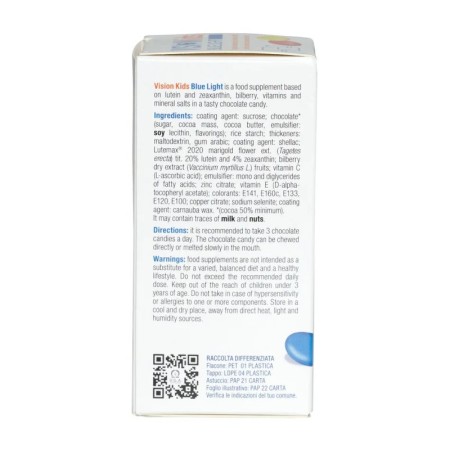 Vision Kids BLUE LIGHT es un complemento alimenticio a base de luteína y zeaxantina, arándano, vitaminas y sales minerales en una sabrosa golosina de chocolate cubierta con una tapa deliciosa y dulce.
